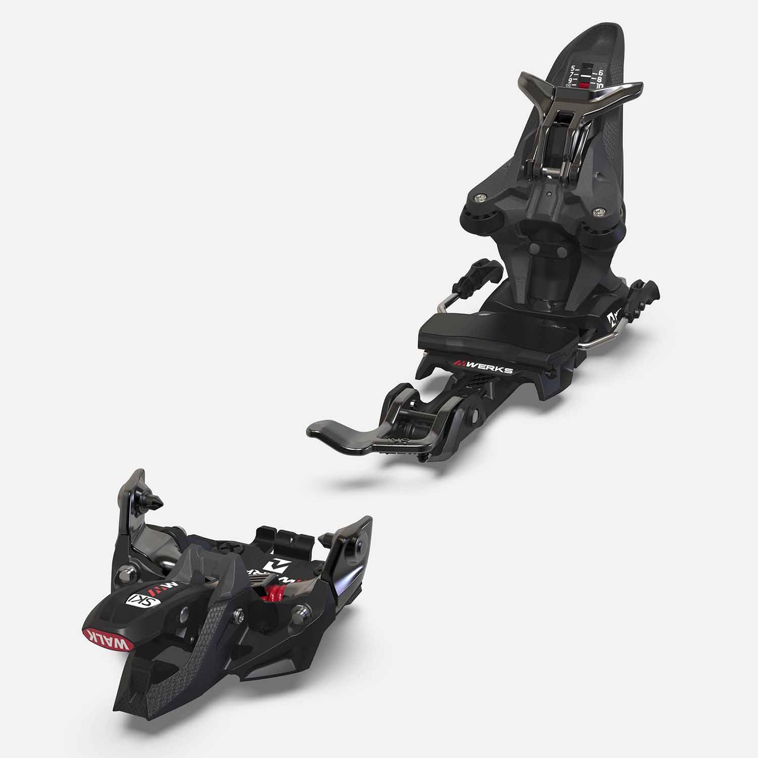 MARKER’s state-of-the-art performance pin binding with DIN settings of up to 12. The Kingpin M-Werks 12 has a carbon-reinforced heel and weighs just 655 g including brake. It offers the ultimate in uphill and downhill performance thanks to features such as an XXL power transmitter and ergonomically shaped climbing aid. A very stiff, similarly carbon-reinforced front with an ISI toe piece makes the binding easier to step into, as a wide footprint with integrated stop automatically positions and aligns your boot. Kinematically optimised pin levers then allow the pins to snap shut with just a gentle push.